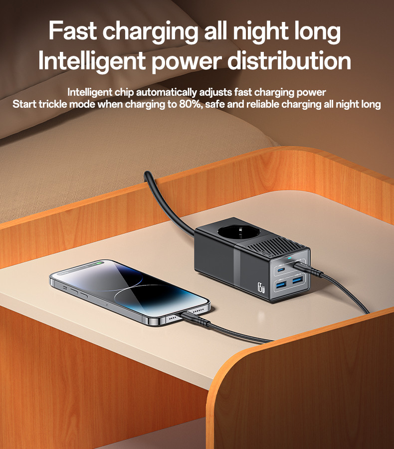 هاب برق MC36 ترکیبی از پریز برق متناوب (AC)، درگاههای USB-A و دو پورت Type-C است. هدف اصلی آن این است که همزمان بتوانی وسایل برقی و الکترونیکی مختلفی مثل لپتاپ، تلفن همراه، تبلت و لوازم جانبی را بهصورت یکپارچه تأمین برق کنی.بدنه آن از جنس PC مقاوم در برابر آتشسوزی (fireproof PC) طراحی شده است تا امنیت بالاتری داشته باشد. این دستگاه مجهز به فناوری GaN (نیترید گالیوم) است تا بهرهوری شارژ را افزایش دهد، گرمای تولیدی را کاهش دهد و ابعاد کلی دستگاه کوچکتر شود. مطابق استاندارد اروپایی طراحی شده و مناسب استفاده در مناطقی است که برق AC با پریز اروپا مورد استفاده قرار میگیرد. ---⚙️ مشخصات فنی MC36ولتاژ ورودی: AC 100 تا 240 ولت، 50/60 هرتز توان خروجی پریز AC: تا ۲۵۰۰ وات (10 آمپر) توان خروجی هر پورت Type-C: حداکثر ۶۵ وات توان خروجی هر پورت USB-A: ۱۸ وات مجموع توان خروجی USB / Type-C و ترکیب آنها: ترکیبهای مختلطی که بین پورتها تقسیم میشود (مثلاً جمع توان C1 + C2 + U1 + U2 محدود به مقدار کل تعریف شده) پشتیبانی از پروتکلهای شارژ سریع مانند QC، PD، PPS، SCP، SVP طول کابل: ۱۵۰ سانتیمتر وزن ناخالص بسته: ۳۹۷ گرم مواد ساخت: ترکیب ABS + PC مقاوم در برابر آتش استاندارد پلاگ: پریز اروپا (European standard plug)